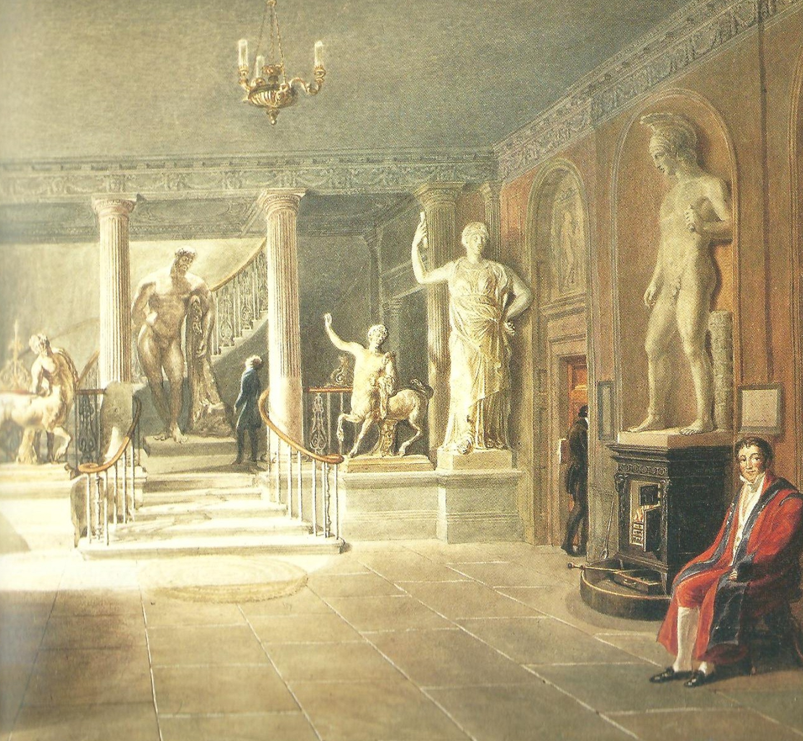 Looking at paintings, portraits and prints of the period was of course invaluable in helping me to describe the settings and characters of the novel too. In particular, James Fenton’s, School of Genius: a history of the Royal Academy of Arts contains wonderful reproductions of prints and paintings of the interiors of the Royal Academy at Somerset House in the late eighteenth and early nineteenth century. Although this wing of Somerset House now belongs to the Courtauld Gallery, it is still possible to feel the traces of the eighteenth century there; the central curving staircase is still as steep to climb as it was in Henry Fuseli’s day. The original ‘Great Room’, where the annual exhibition took place, is now divided up into a series of smaller exhibition rooms and displays famous twentieth-century paintings and drawings. However, if you look up, you can still see the three original arched windows that would have toplit the Great Exhibition Room where the English royalty had the first ‘view’ each year. An immense number of paintings were hauled up the three floors, via the curved staircase, and filled every spare inch of the exhibition space, just as they do today in the Royal Academy’s new headquarters and gallery in Piccalilly.